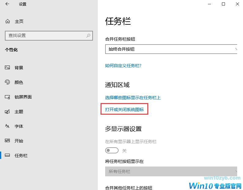 4、在任务栏界面中,点击选择打开或关上系统图标选项;