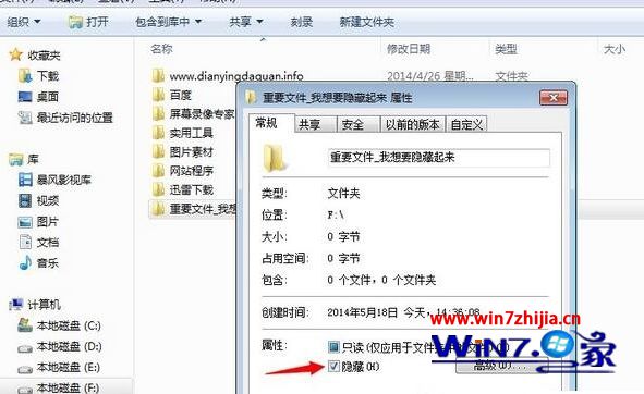 2、鼠标右键单击,进入属性,设置文件夹为隐藏,如下图: